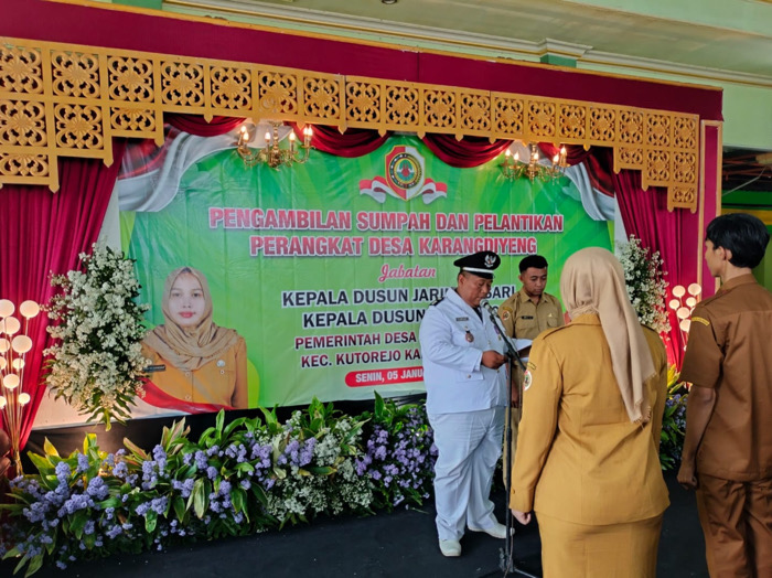 MOJOKERTO, GSN.com – 5/1/2026, Kepala Desa Karangdieng, Affandi, S.H., melaksanakan dua pelantikan perangkat desa sekaligus dalam satu prosesi resmi yang berlangsung khidmat dan tertib. Pelantikan tersebut menetapkan Anik Musayada sebagai Kepala Dusun Jaringan Sari dan Moh. Wafa sebagai Kepala Dusun Selorejo, senin tanggal menyesuaikan.